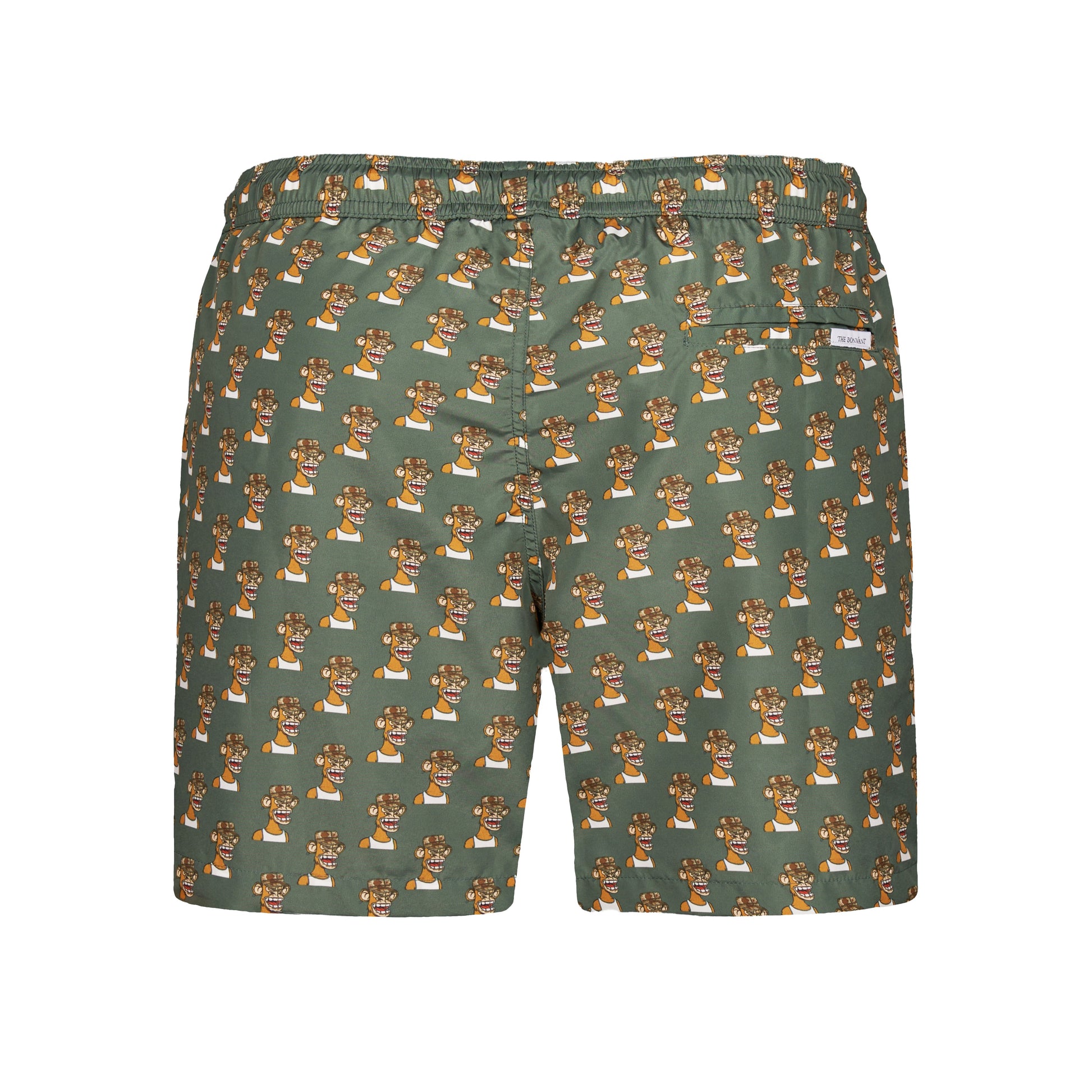 Men's Swim Shorts with BASC #4398 print on green background. Unique product, numbered and in a limited edition. His purchase from access to the prestigious auction for the sale of the NFTBored Ape Solana Club #4398.