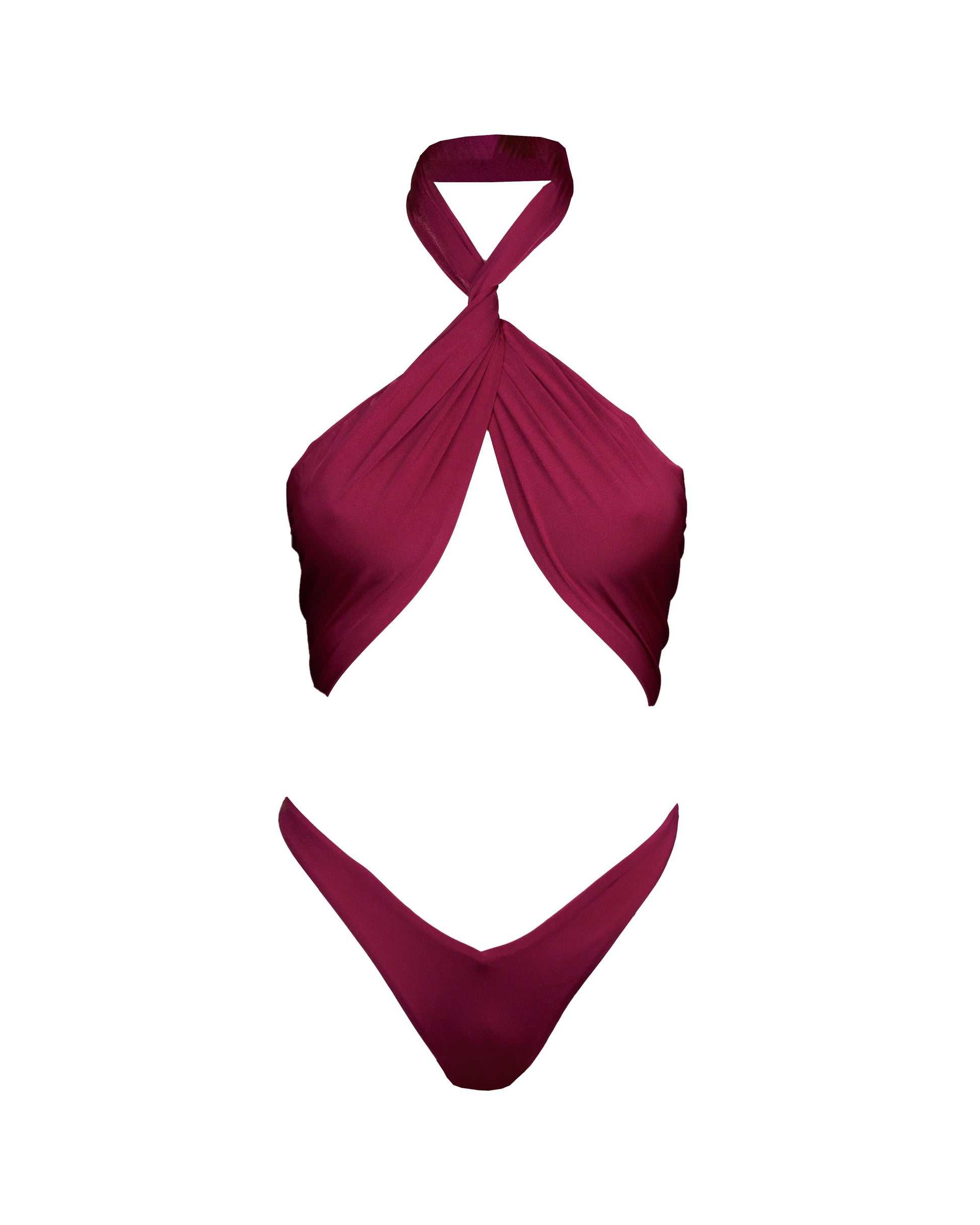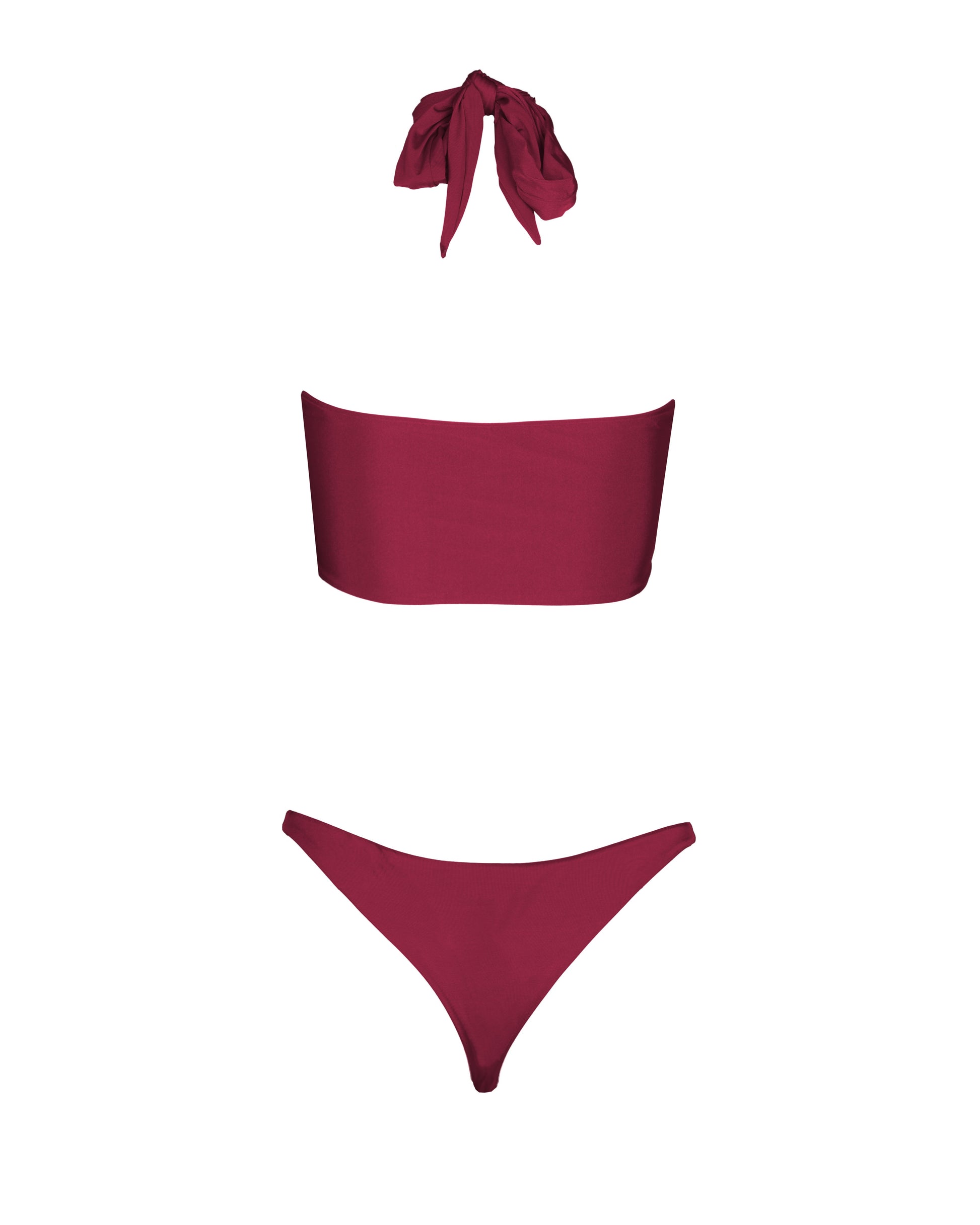 Bikini donna a fascia incrociata tinta unita color bordeaux shimmer.