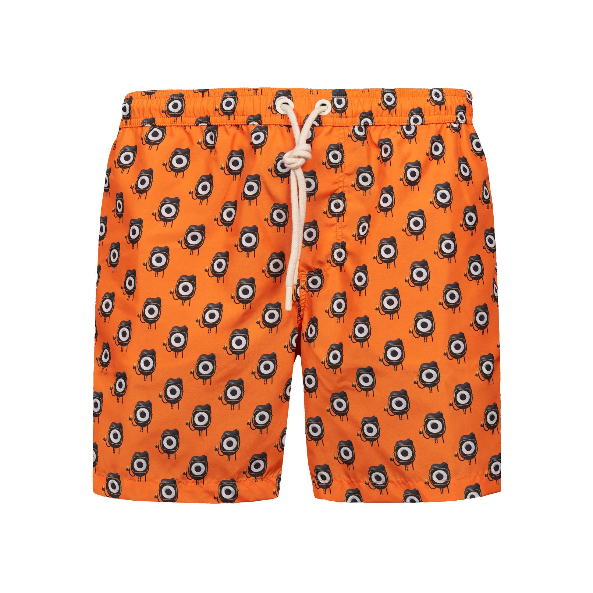 Pantaloncini da bagno da uomo stampa Dour Darcel #403 su sfondo arancione. Prodotto unico, numerato e in tiratura limitata. Il suo acquisto da accesso alla prestigiosa asta per la vendita dell'NFT Dour Darcel #403.