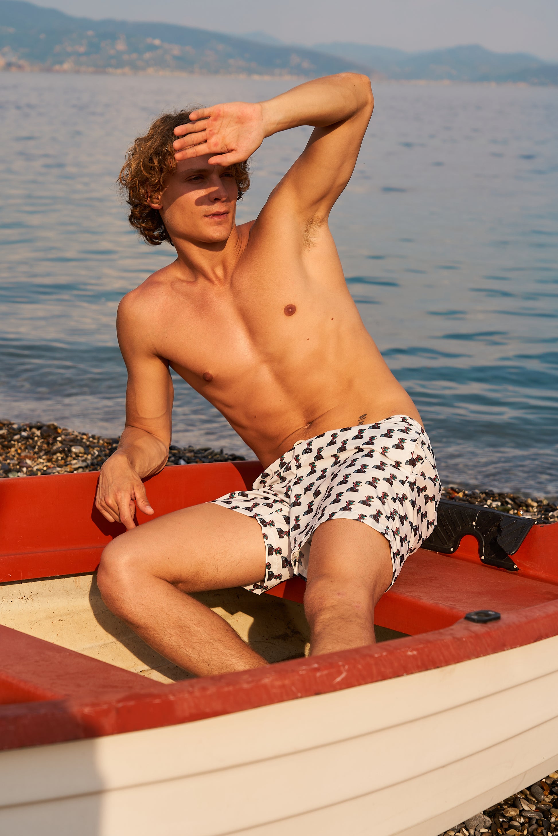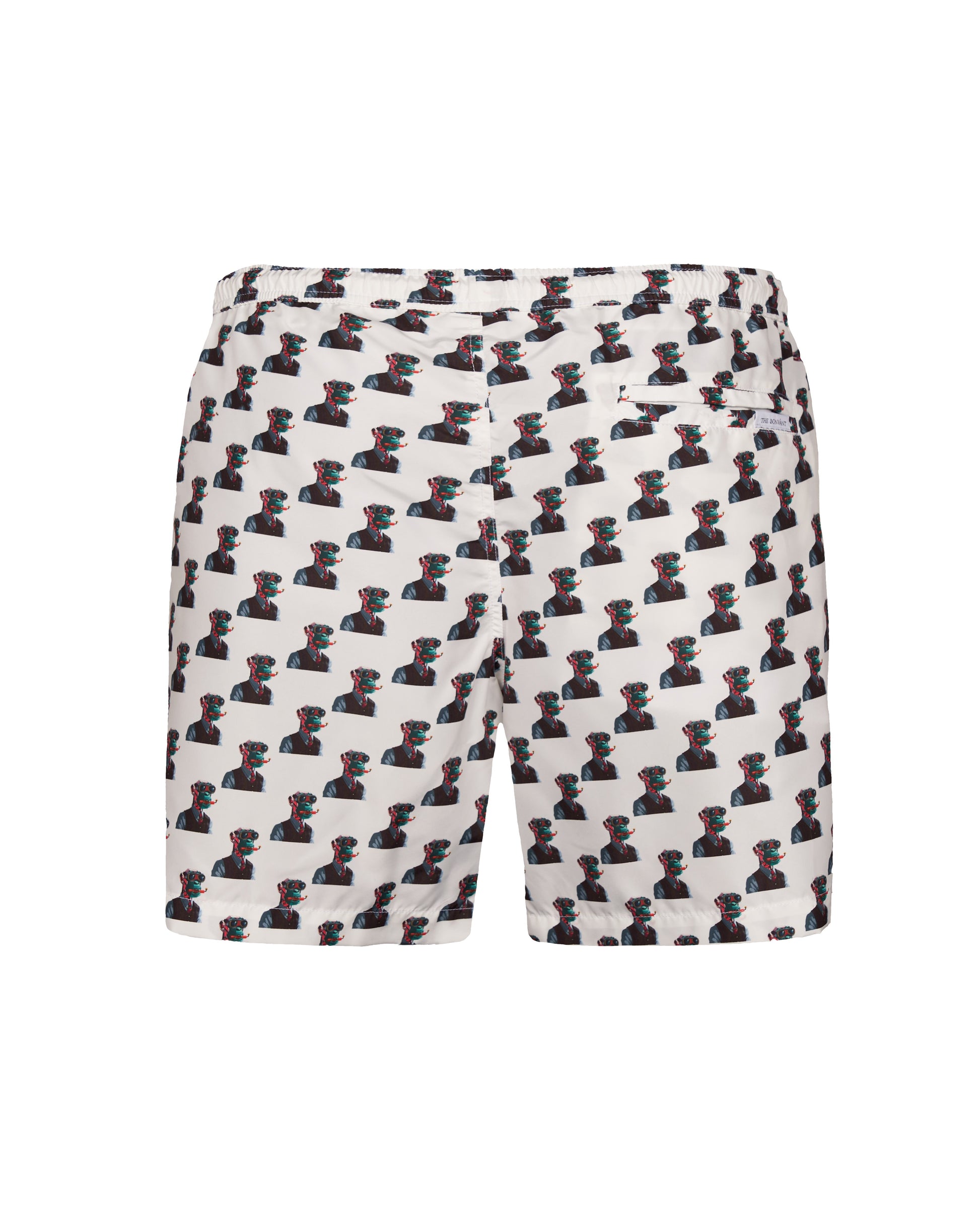 Pantaloncini da bagno da uomo stampa Primates #9505 su sfondo bianco. Prodotto unico, numerato e in tiratura limitata. Il suo acquisto da accesso alla prestigiosa asta per la vendita dell'NFT Primates #9505.