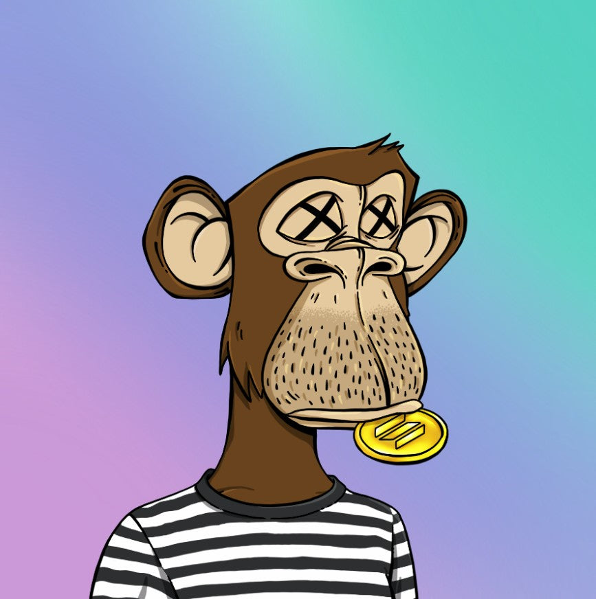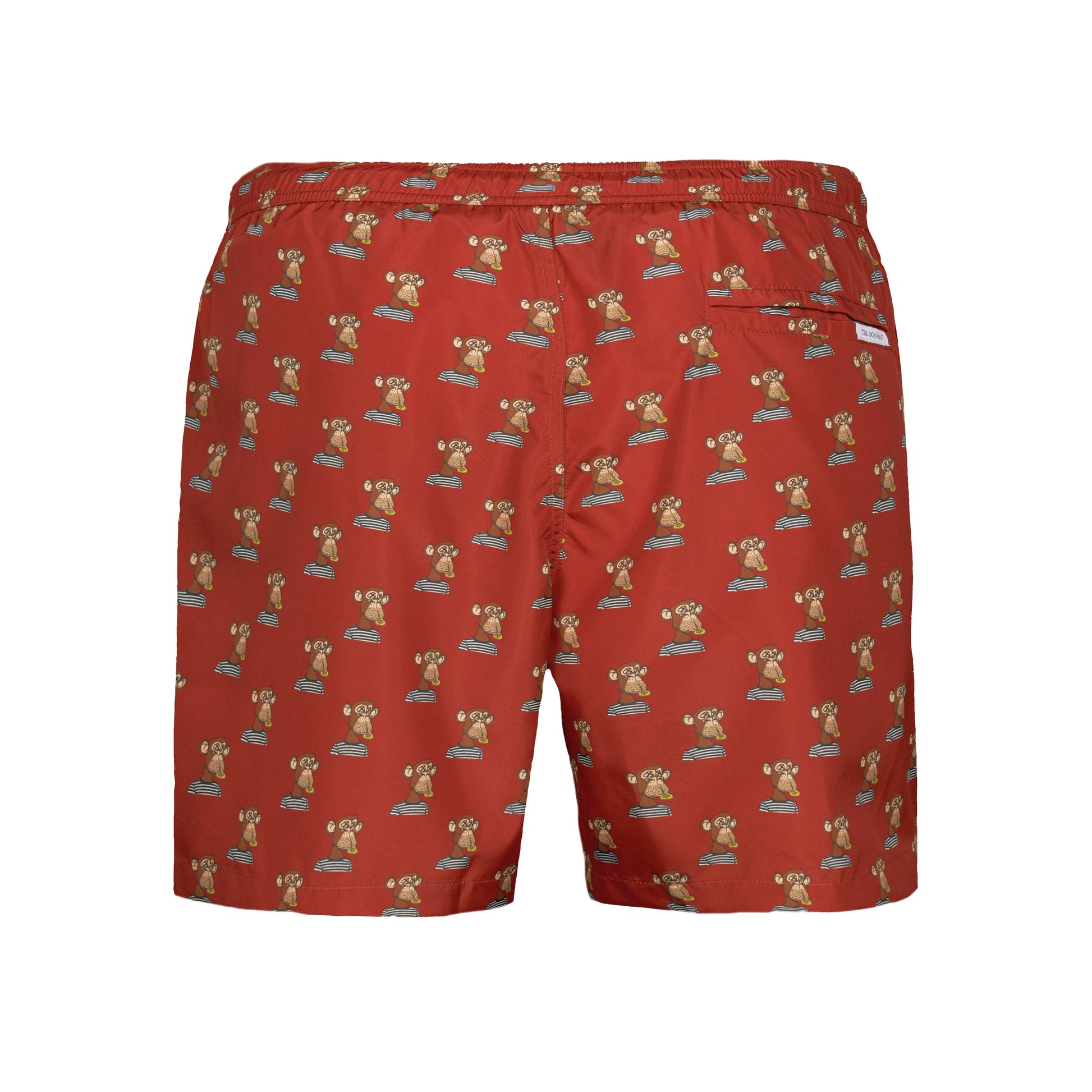 Pantaloncini da bagno da uomo stampa BASC #2883 su sfondo bordeaux. Prodotto unico, numerato e in tiratura limitata. Il suo acquisto da accesso alla prestigiosa asta per la vendita dell'NFT Bored Ape Solana Club #2883.